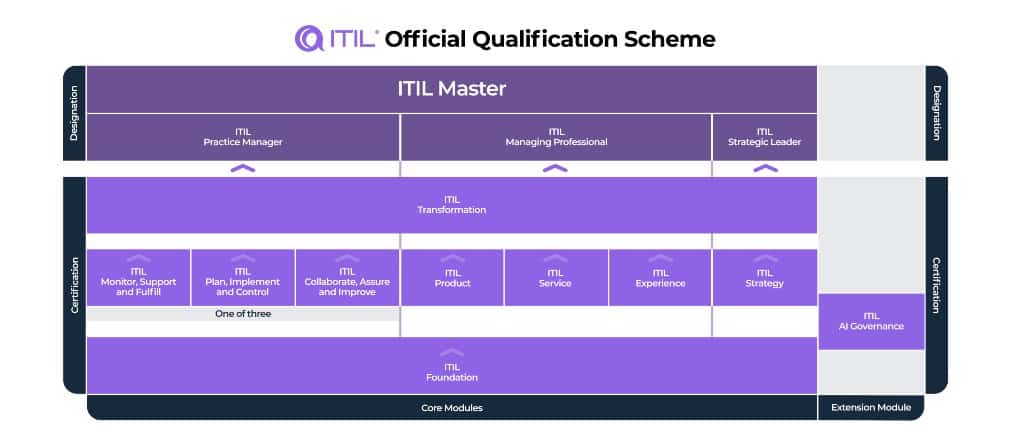 El esquema comienza con ITIL Foundation y se estructura en tres streams principales más un módulo de extensión .